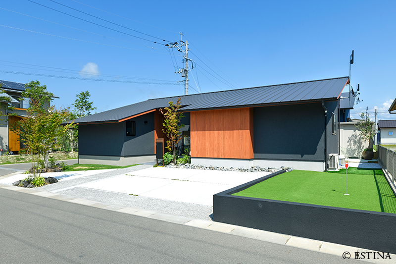 ファサードにこだわり、細部まで丁寧にデザインしました。 常用車とゲスト用の車をそれぞれ駐車できるよう、ゲスト用パーキングは家に対して斜めに配置し、普段は駐車スペースの印象が強くならないよう工夫しています。 植栽で視線をやわらかく受け止める“アイストップ”をつくり、玄関周りが広く見えすぎないようバランスを整えました。 また、芝の起伏で変化のある表情を加え、夜間は玄関へ自然に導くライティングを配置しています。