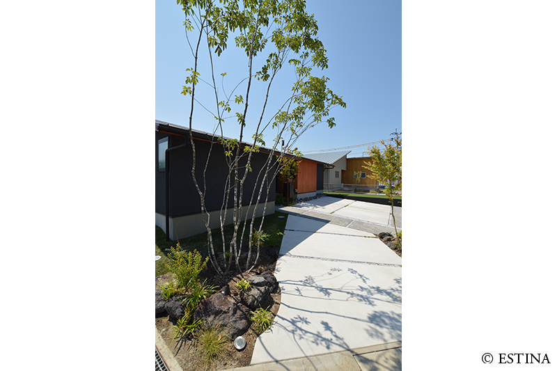 植栽で視線をやわらかく受け止める“アイストップ”をつくり、玄関周りが広く見えすぎないようバランスを整えました。